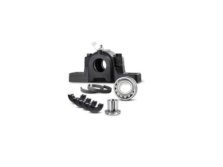 Cada uno de los juegos consta de una carcasa de chumacera dividida de la serie SNL200 o 500 en combinación con un rodamiento de bolas a rótula o un rodamiento de rodillos, los anillos de posicionamiento apropiados para un ajuste perfecto del rodamiento, sellos y, para insertos de rodamiento con forma cónica. anillo interior, el manguito adaptador adecuado.